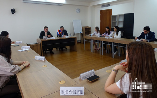 On July 19th, the Ambassador of the Kingdom of the Netherlands to the Republic of Armenia, H.E. Mr. Nico Schermers met with the students of the “International Relations and Diplomacy” programme of the Diplomatic School. Ambassador Schermers briefly introduced the history of the Netherlands to the students, spoke about the pillars of the foreign policy of the country, the Dutch experience in water management and the Armenian community in the Netherlands. He told about his country’s relations with Armenia and answered questions from the audience.
